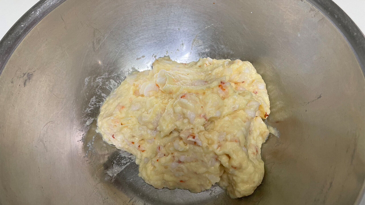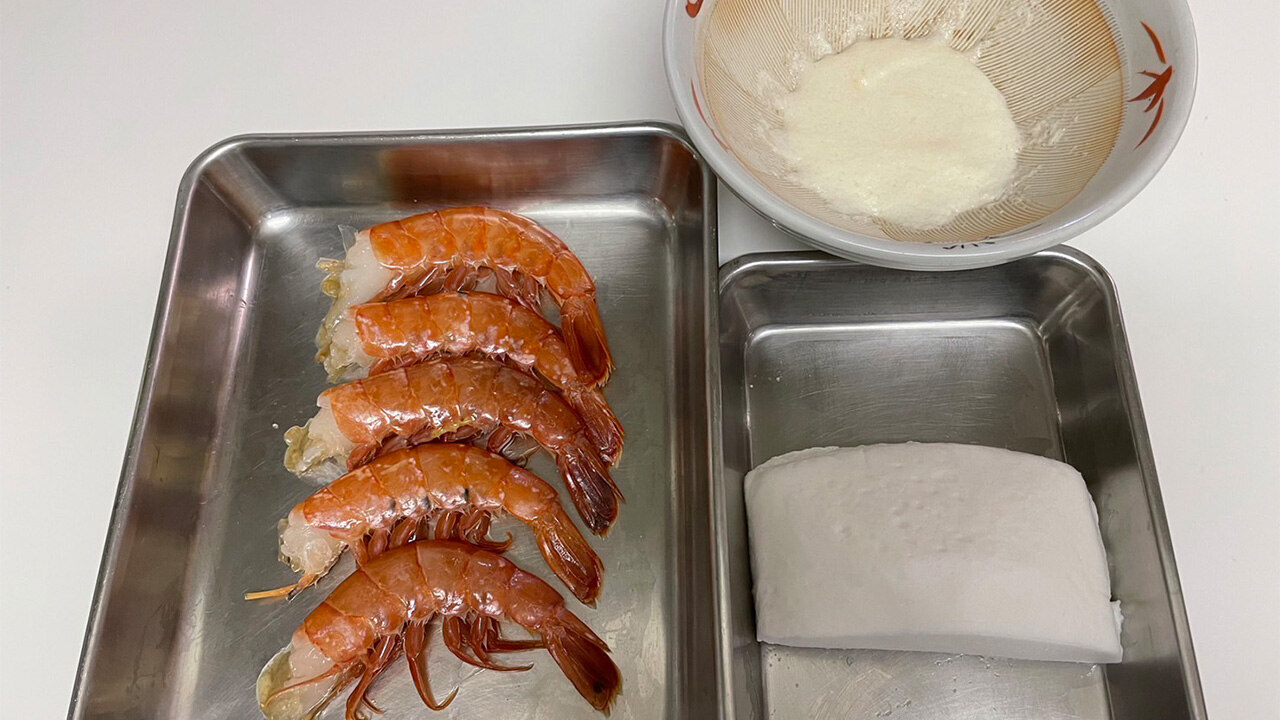 ①沸騰したお湯で海老をさっと茹で、食感が残る程度に刻む