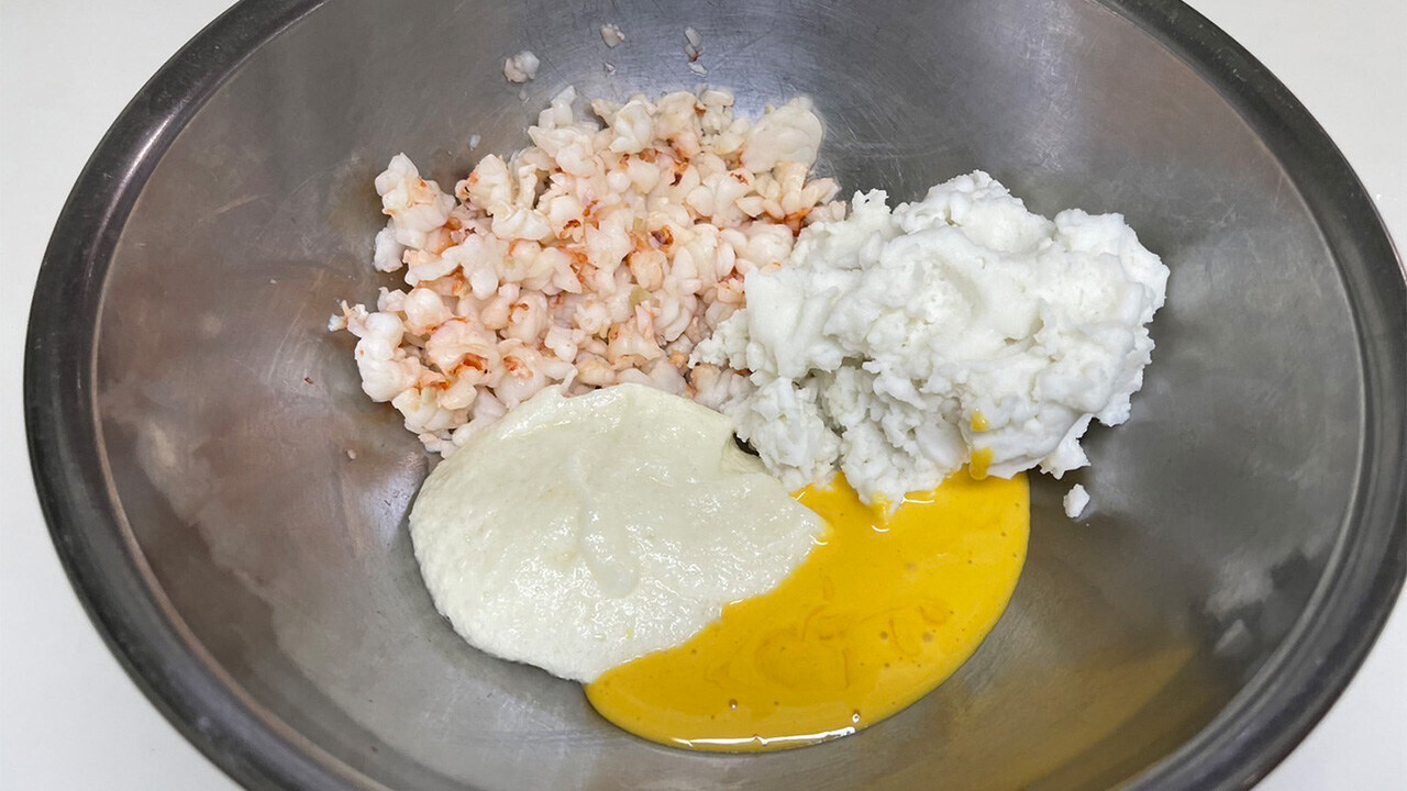 ② フードプロセッサーにかけたはんぺん、海老、卵の黄身、片栗粉、塩を混ぜ合わせる