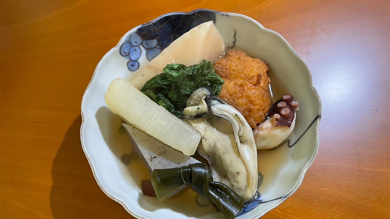 ④ ③ にタコ、結び昆布、大根、こんにゃく、ちくわを入れて15分ほど煮る