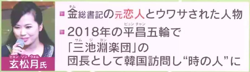 この女性は、金総書記の元恋人というウワサされた人物・玄松月(ヒョン・ソンウォル)氏です。2018年の平昌五輪では『三池淵(サムジヨン)楽団』の団長として韓国を訪問し、“時の人”に。北朝鮮・元外交官の高英煥(コ・ヨンファン)氏によると、「玄氏には、絶大とも言える権限が与えられている」といいます。