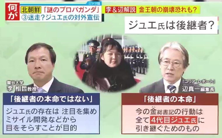 ジュエ氏が後継者である可能性についても、李教授は「後継者の本命ではない。ジュエ氏の存在は、注目を集めミサイル開発などから目をそらすことが目的」、辺氏は「後継者の本命。今の金総書記の行動は、全て4代目・ジュエ氏に引き継ぐためのもの」と見解が分かれています。
