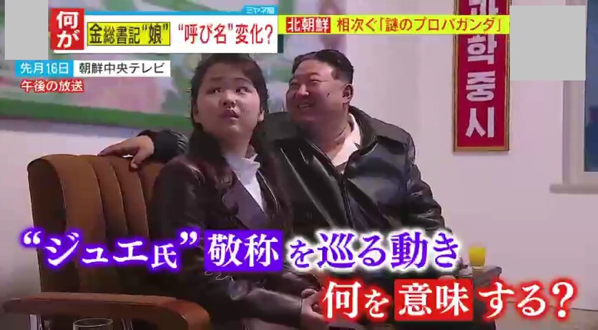 2024年3月16日、金正恩総書記と式典に出席した娘・ジュエ氏。これまで「愛するお子様」「尊いお子様」「尊敬するお嬢様」など呼称が変わってきましたが、『朝鮮中央テレビ』午前のニュースでアナウンサーが「“嚮導(きょうどう)”の“偉大な”方々が、党や政府・軍部の幹部たちと共に、温室農場を見て回られた」などと3回にわたり“嚮導”という表現を使用しました。