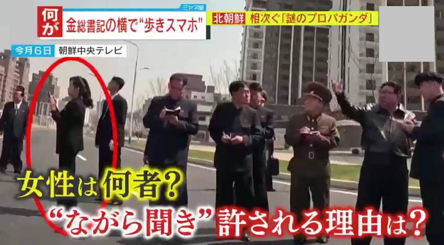 金総書記の周りの気になる女性は、他にもいます。4月5日、住宅地を視察する金総書記の後ろで、スマホを見ながら歩く女性。他の場面でも、一生懸命メモを取る人たちを他所に、背を向けてスマホを触っていました。