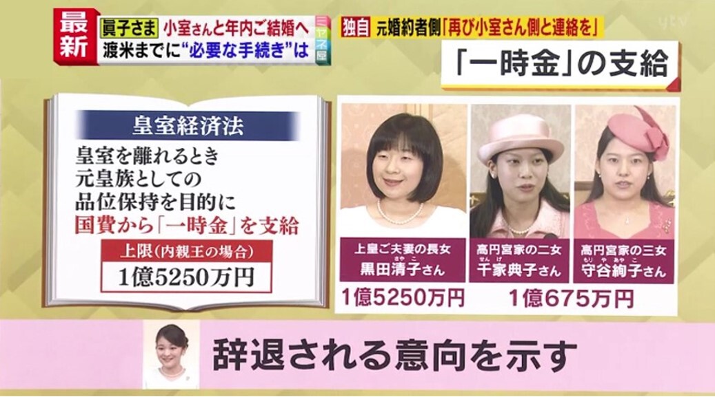 Q.眞子さまは一時金1億5千万円ほどの受け取りを辞退される意向ということですが、これは有識者会議を開いて決めるのですか?