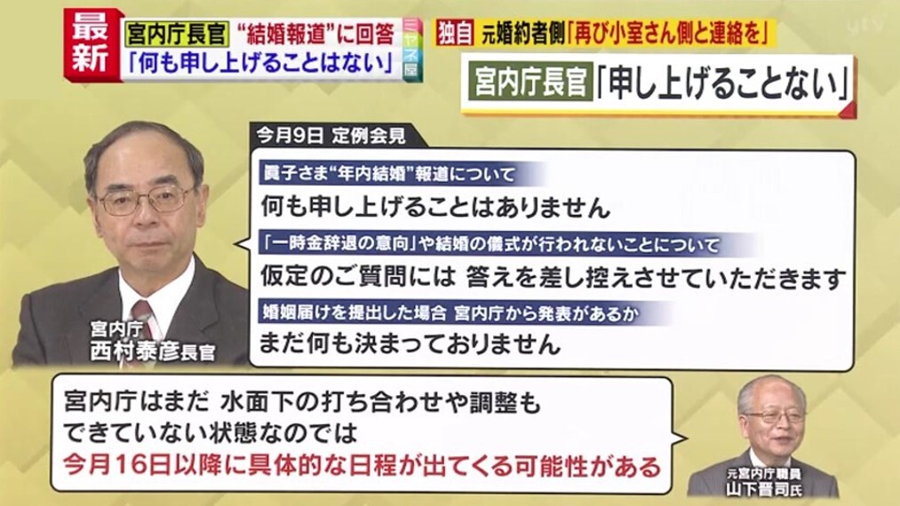 宮内庁長官は9月9日に開かれた定例会見で、「年内結婚報道については、何も申し上げることはありません。また一時金辞退の意向や結婚の儀式が行われないことについては、仮定のご質問には答えを差し控えさせていただきます。婚姻届を提出した場合、宮内庁から発表があるかどうかについても、まだ何も決まっておりません。」と話しました。