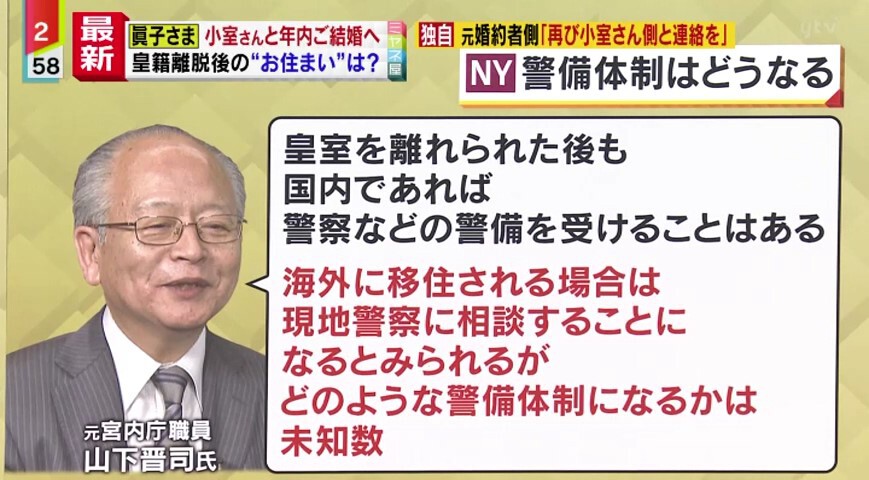 Q. ニューヨークの住宅事情も気になるところですが…仮にニューヨークで小室さんと眞子さまが、警備体制が不十分だなと思い警備体制を強化してほしいということになると、ご自身の収入から出さなきゃいけない?