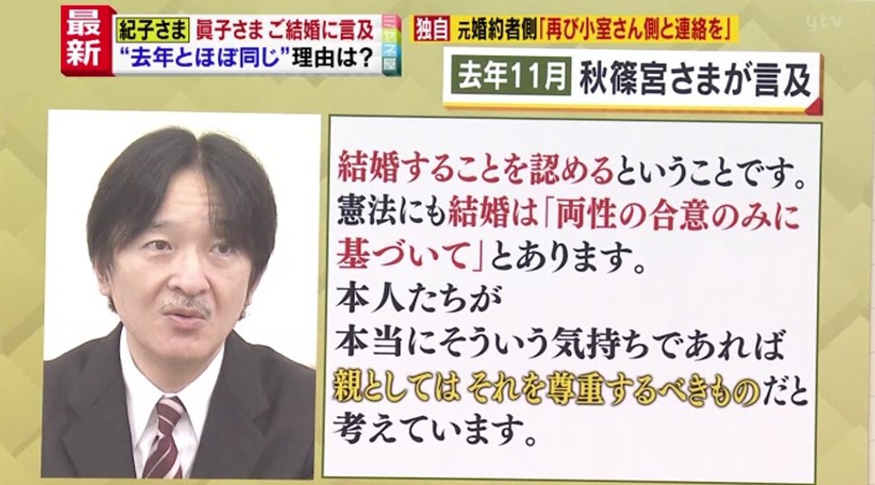 「内容的には全く同じで、2020年の妃殿下のお誕生日の文書回答と今回の文書回答の間に、秋篠宮殿下の2020年11月の記者会見があるわけですが、そこで『結婚を認める』とか、『親としては、それを尊重するべき』とまで殿下がおっしゃっているわけです。ですから、秋篠宮殿下の記者会見の後の文書回答が、その記者会見の前と同じっていうところが、妃殿下はまだ踏ん切りがつかないというか、お気持ちが2020年9月と全く変わっておられないのかなと。ですから殿下のお言葉を受けた部分がないんです。」