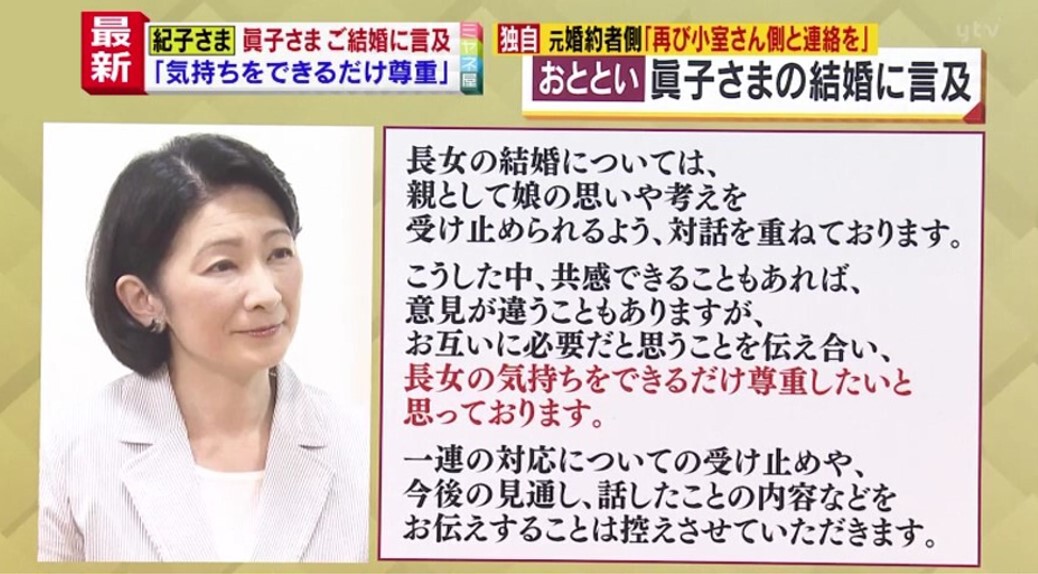 「そうですね、紀子さまは『できるだけ』とか、2020年は『できるかぎり尊重したい』というか、なんかちょっと諦めきれないというか、なんかそういうものが滲み出てるいなあというふうに私は思っています。妃殿下がどういう気持ちかまでは、なかなか分からないですけども、相当苦しんでおられるだろうなと。殿下もそうですけれども。そもそも今回の文書回答で、新しいことは出てこないと思っていたんです。当たり障りのないご回答しか、おそらく妃殿下はなさらないだろうと。それでも、2020年の殿下のご発言をなぞるようなものはあってしかるべきだと思っていたんです。要は、『殿下がおっしゃったように』というのは、あってもしかるべきだと思うんですけど、それすらないんでね、やはり何か殿下とはやっぱり少しその受け止め方といいましょうか、お気持ちが違うといいましょうか、何か諦めきれない、というお気持ちが妃殿下には相当強いのかなっていうふうには思いました。」