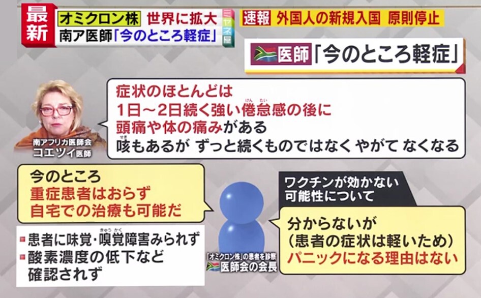 「もちろん、そうなんですが、こういった新たな変異株というのは、どうなってくるか全く分からないのと、いま分かっている情報が非常に少ないですので。最低限、入れないことは大事なので、水際対策の強化という意味では、これまでの対策からすれば、今回は早い決断だったかなと私は思っています」