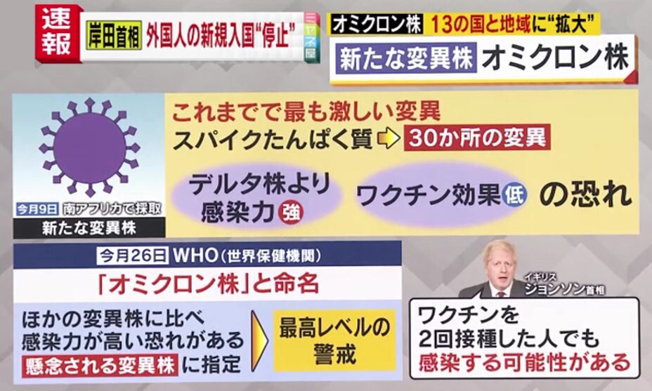また、イギリスの放送局BBCによりますと、「デルタ株」より感染力が強く、ワクチン効果が低い恐れがあるといいます。また、イギリスのジョンソン首相は「ワクチンを2回接種した人でも感染する可能性がある」と話しています。イギリスでは、すでに「オミクロン株」の感染者が確認されたため、南アフリカなど、6か国からの渡航を禁止にするなど、警戒を高めています。