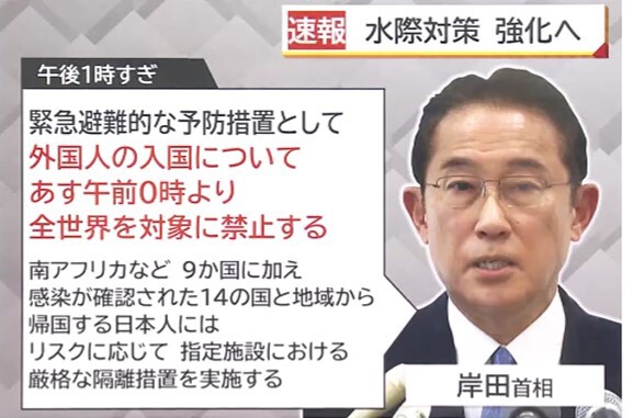 「我が国も最悪の事態を避けるため緊急避難的な予防措置として、まずは外国人の入国については、11月30日午前0時より全世界を対象に禁止します。そして日本人等でも南アフリカなど、9か国に加え、感染が確認された14か国から帰国する場合には施設における厳格な隔離措置を実施いたします」