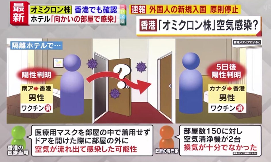 一方、香港では、気になる事例もあります。香港メディアによると、香港に入国後、隔離で滞在していたホテルで、まず、南アフリカから香港に入国した男性の陽性が判明。その5日後、その向かいの部屋に滞在していた、カナダから香港に入国した男性の陽性が判明しました。香港の医療当局は「医療用マスクを部屋の中で着用せず、ドアを開けた際に部屋の外に空気が流れ出て感染した可能性がある」としています。