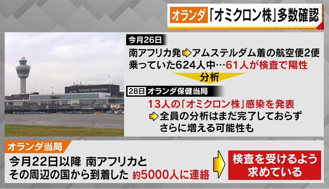オランダでは、多くの陽性者が確認されています。11月26日、南アフリカ発アムステルダム着の航空便2便に乗っていた624人のうち、61人が検査で陽性。分析したところ、28日、オランダ保健当局は13人の「オミクロン株」感染を発表。全員の分析は、まだ完了しておらず、さらに増える可能性もあります。実際に南アフリカからオランダに帰国したオランダ人は…
