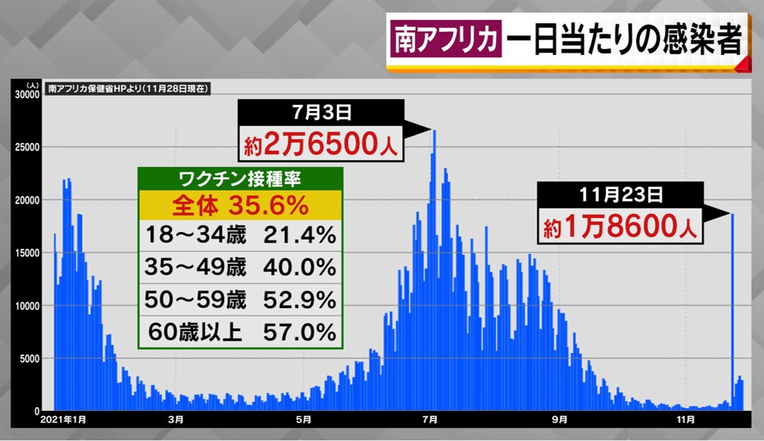 11月25日時点で、77人の「オミクロン株」感染が明らかになっている“震源地”南アフリカ。日本時間の11月27日、港町・ダーバンで開かれたナイトマーケットでは、狭い通路を多くの人が行き交っていました。「オミクロン株」が見つかって以降も、まだ、街に大きな変化はないといいます。南アフリカのケープタウンでは、多くの人が行き交っていました。