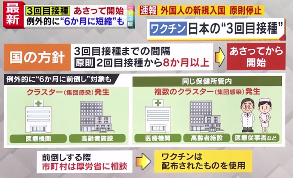 ワクチンの“3回目接種”について、国の方針では、「原則2回目接種から8か月以上」の間隔をあけて行うとし、12月1日から開始するとしています。例外的に「6か月に前倒し」する対象について、「クラスターが発生した医療機関」や「高齢者施設」など、同じ保健所の管轄内で複数、クラスターが発生した場合はそれに加え、その地域の「医療従事者」などとすることを厚労省が明らかにしました。接種を前倒しする際は、市町村が事前に厚労省と相談の上、配分されたワクチンを使用します。