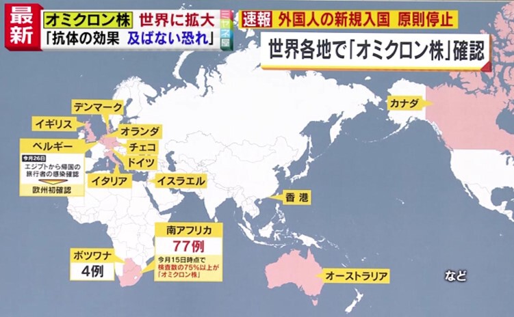 この「オミクロン株」は世界各地で確認され、すでに13の国や地域に拡大しています。南アフリカでは、11月15日時点で、検査数の75%以上が「オミクロン株」で、11月25日時点では77例確認されています。その隣、ボツワナでは4例、また、ベルギーでは11月26日エジプトから帰国の旅行者の感染確認。これはヨーロッパで初確認でした。そのほか、イギリス、ドイツ、イタリア、オランダ、デンマークそしてイスラエル、香港、オーストラリアで確認されています。