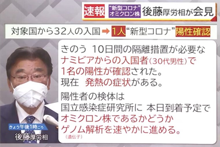 「陽性検体は国立感染症研究所に29日到着予定で、“オミクロン株”であるかどうかゲノム(遺伝子)解析を速やかにすすめる予定です。引き続き検疫で陽性となったすべての検体についてゲノム解析を実施するとともに、自治体主体の全ゲノム解析を従来お願いしている5%~10%にとどまらず、現時点での検査能力を最大限発揮して実施していただくようお願いする等、国内の検査体制も強化していく」