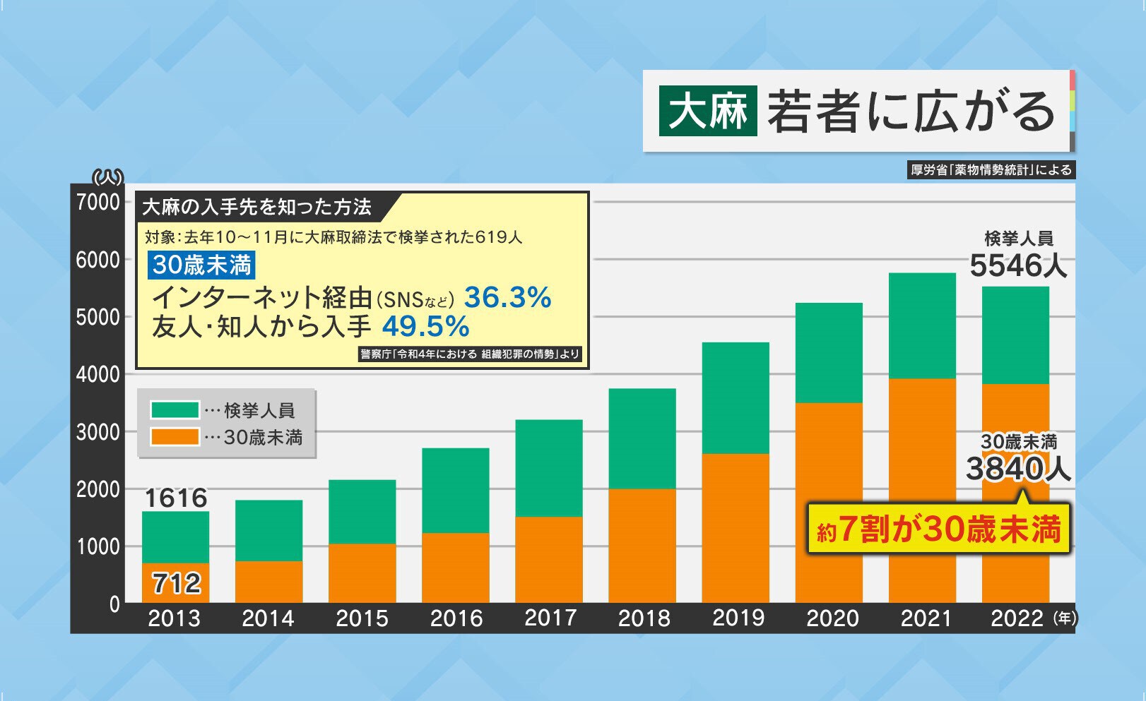 近年、大麻をめぐり検挙された人の数は増加を続け、2022年は5546人となっていて、10年前の3倍を超えています。そのうち30歳未満の若年層は約7割を占めていて、こちらも増加を続けているのが現状です。日本大学アメフト部では、大麻などを所持したり譲り受けた容疑などでこれまでに部員2人が逮捕されています。他にも全国の高校や大学などの学生が大麻に絡む容疑で摘発される事件が相次いでいます。これら30歳未満の若者が大麻の入手先を知った方法としてインターネットが36.3%、友人・知人からが49.5%となっています。