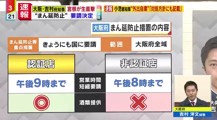 1月21日、新型コロナウイルスの“感染拡大”を受け、大阪府・兵庫県・京都府の3府県は、「まん延防止等重点措置」の適用を国に要請しました。「まん延防止措置」が適用された場合、大阪府では認証を受けている飲食店に対し、午後9時までの時短営業などを要請し、酒の提供は認める方針です。会見を終えた大阪府の吉村洋文知事を直撃、今後の課題などを聞きました。