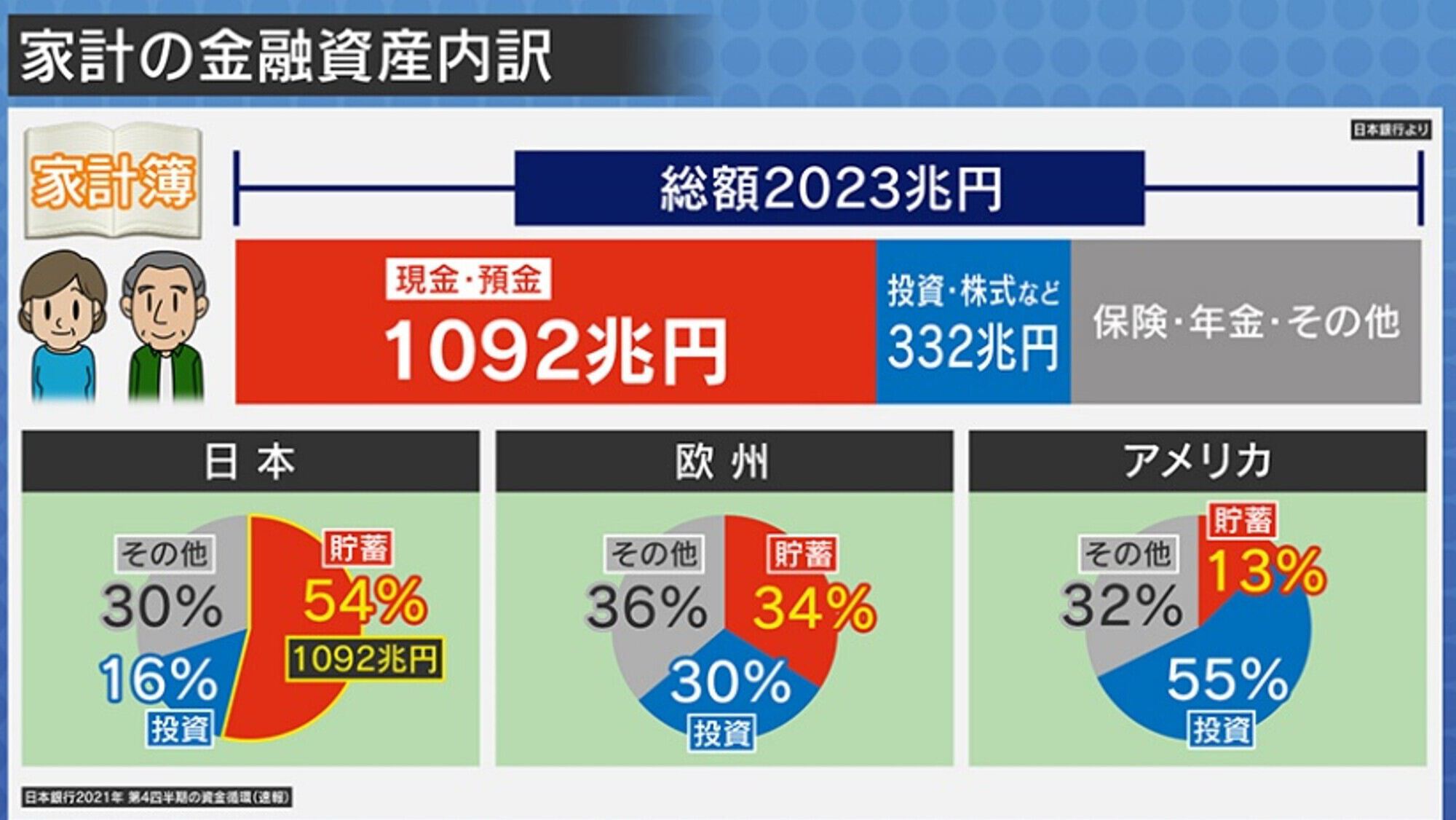 日本の個人の貯蓄額は、世代などによってばらつきはありますが、平均1077万円。全体では約1000兆円に上ります。5月5日ロンドンで岸田首相は、「貯蓄から投資。我が国の個人の金融資産は2000兆円、その半分以上が預金・現金で保有されている。『資産所得倍増プラン』によって、眠り続けてきた1000兆円の預貯金をたたき起こし、市場を活性化するための仕事をしてもらう」と発言しました。