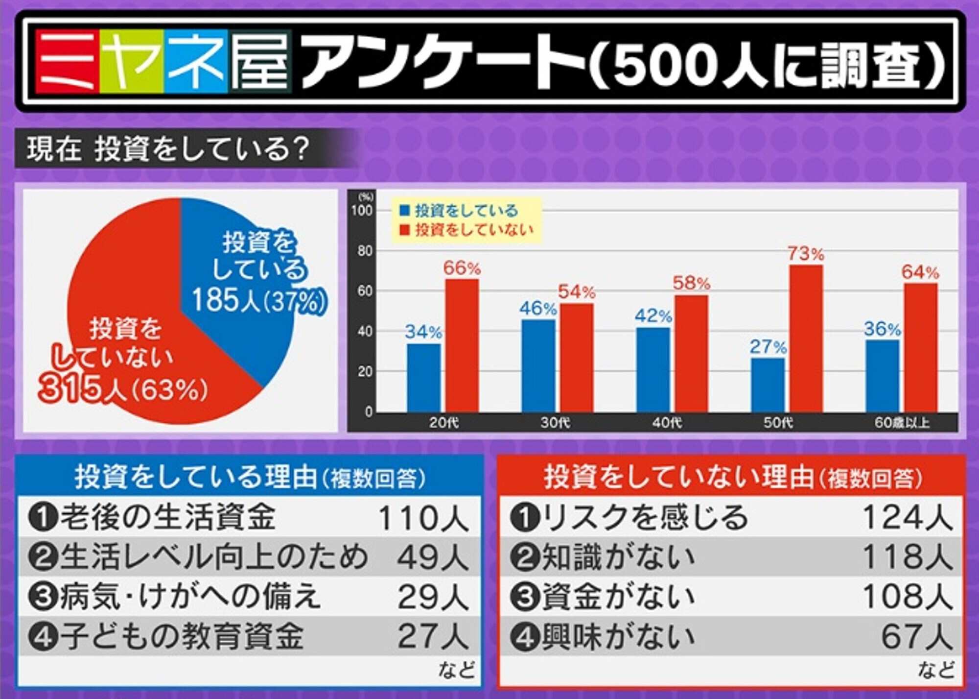 『ミヤネ屋』が行った、投資に関するアンケートによると、「現在投資をしていない」と答えた方が63%、「していると答えた方」が37%という結果になりました。「している」の理由で最も多いのが、「老後の生活資金」次いで「生活レベルの向上」さらに「病気・けがへの備え」「子どもの教育資金」などが続きます。一方で「していない」の理由は「リスクを感じる」が1位で、その後「知識がない」「資金がない」「興味がない」という意見が並んでいます。