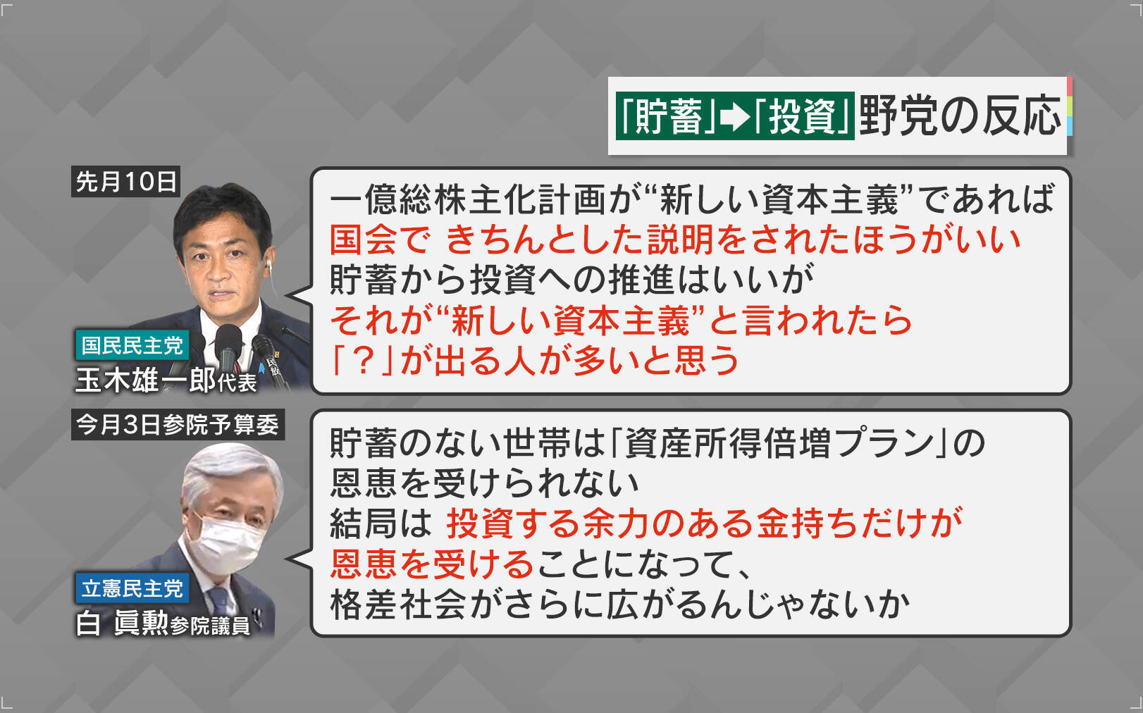 この自民党案に対し、国民民主党の玉木代表は「一億総株主計画が“新しい資本主義”であれば、国会できちんとした説明をされたほうがいい。貯蓄から投資への推進はいいが、それが“新しい資本主義”と言われたら『?』が出る人は多いと思う」と発言。また立憲民主党の白参議院議員は「貯蓄のない世帯はこの『資産所得倍増プラン』の恩恵を受けられない。結局は、投資する余力のある金持ちだけが恩恵を受けることになって、格差社会がさらに広がるんじゃないか」と批判しています。