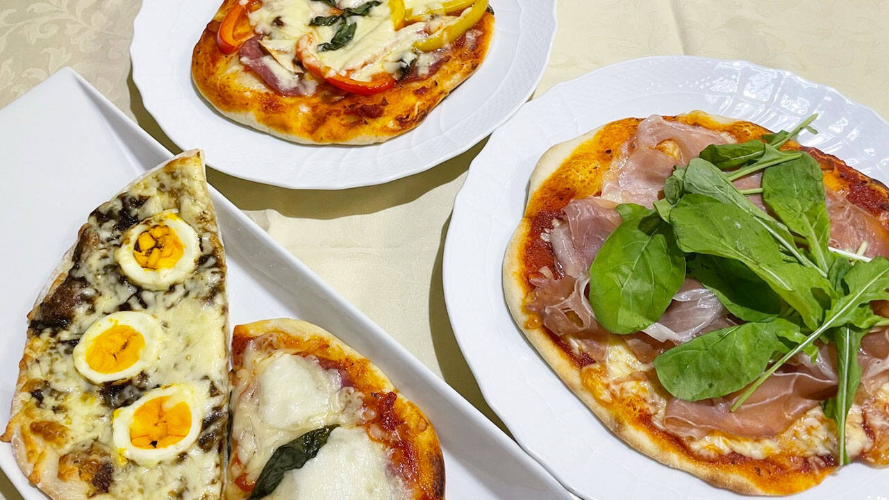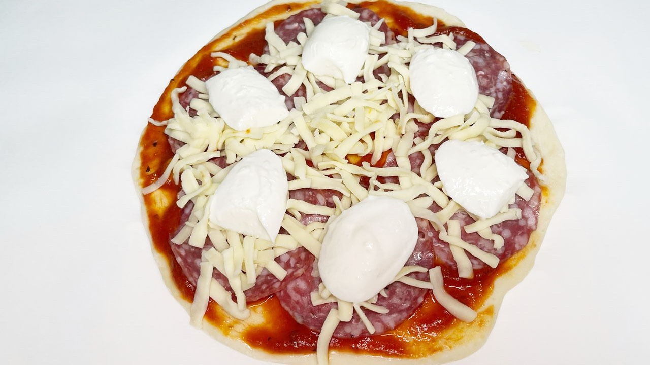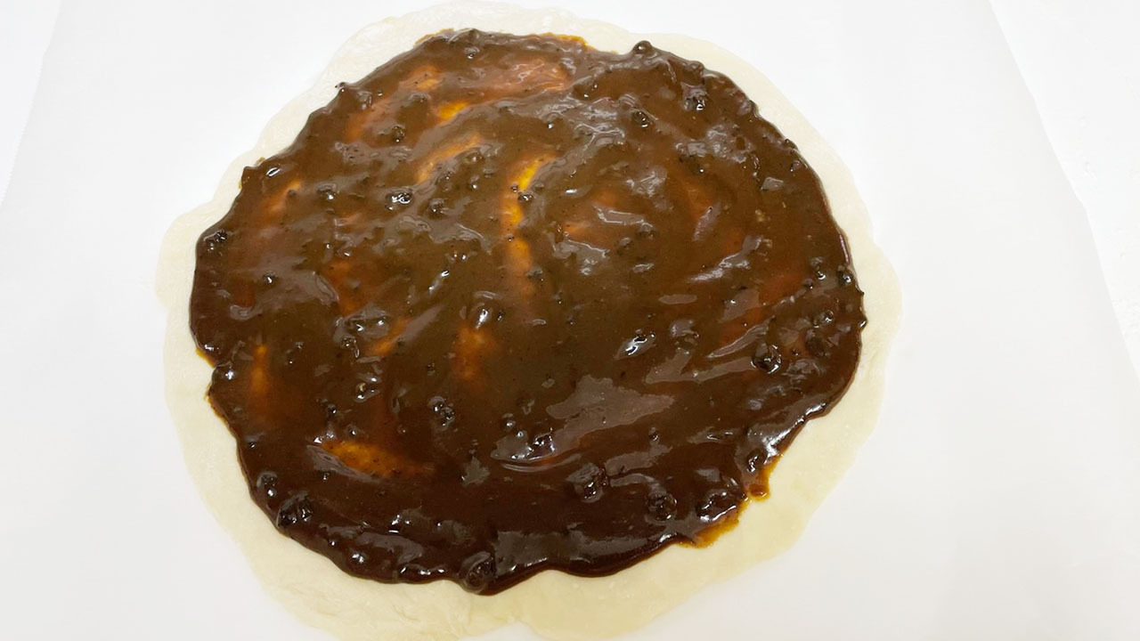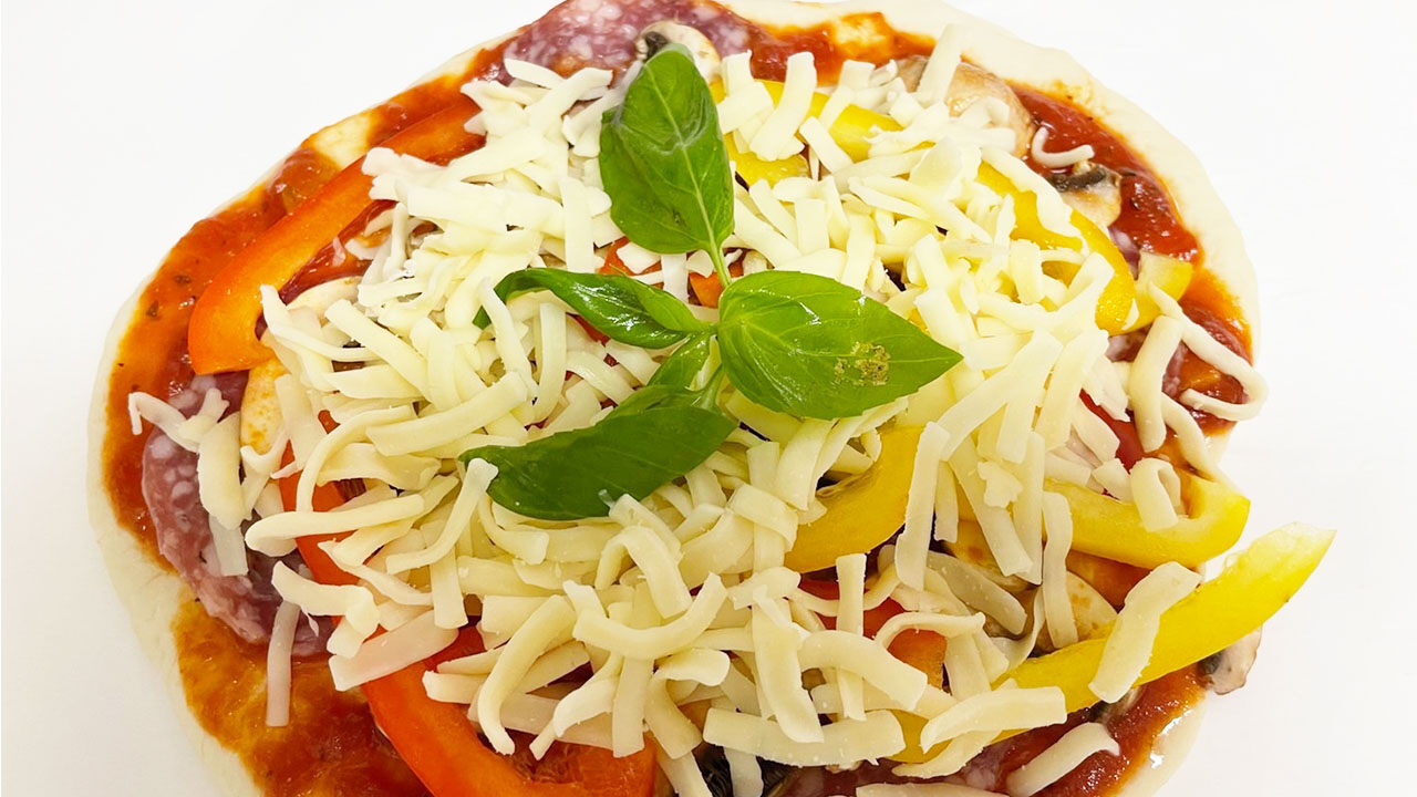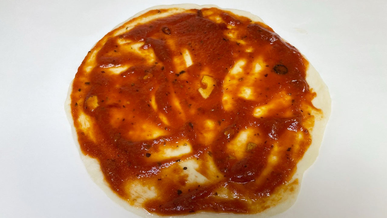 ⑦ トマトソース(市販のもの)を塗り、チーズやお好みの食材をトッピングして、220℃に予熱したオーブンで10〜15分焼いて出来上がり