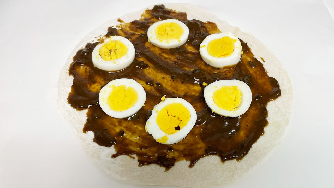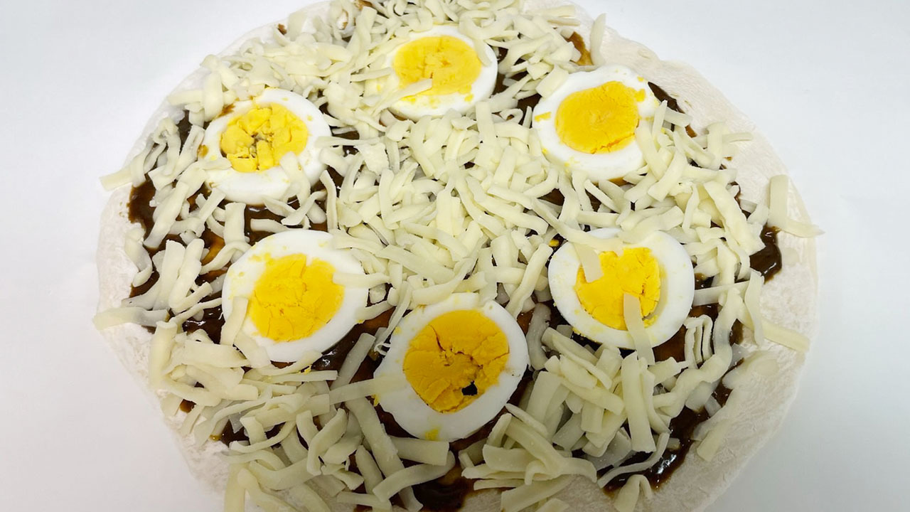 ① ピザ生地にカレーを塗り、ピザ用チーズ、ゆで卵のスライスをのせて焼く
