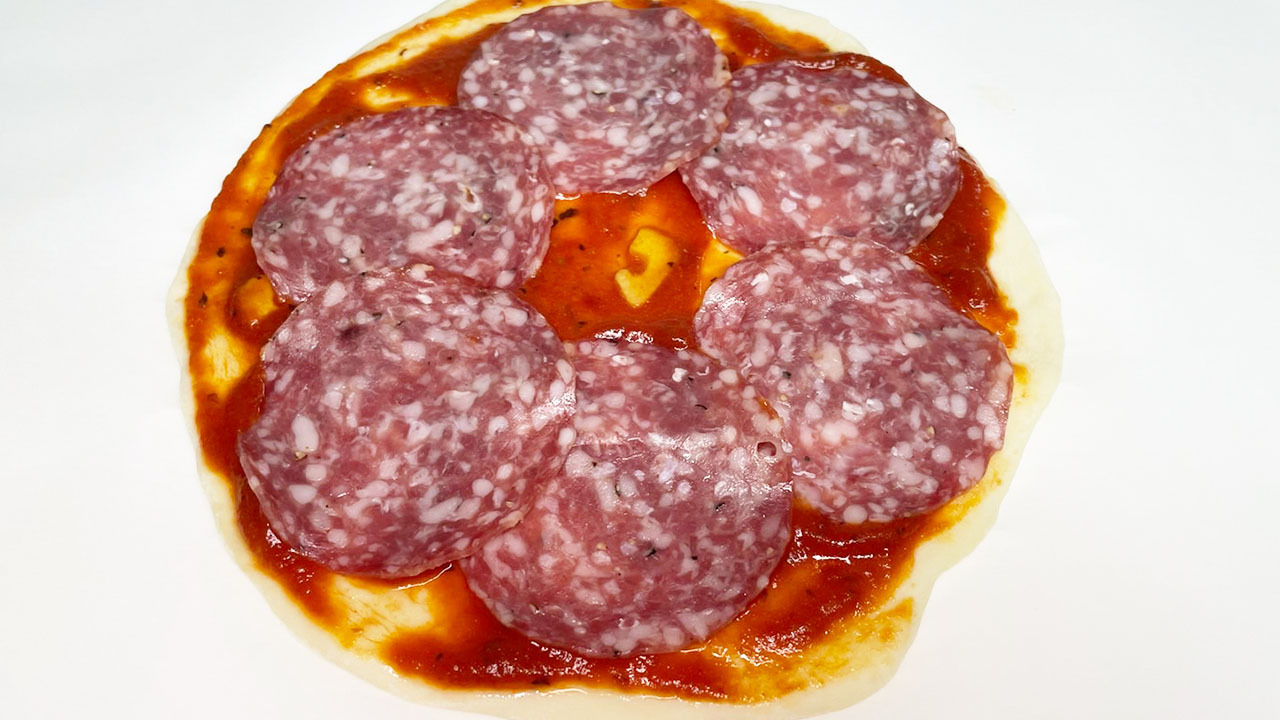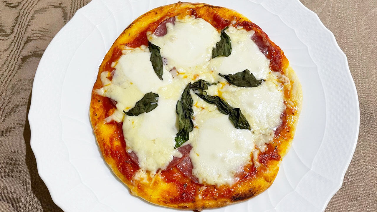 ① ピザ生地にトマトソースをたっぷり塗り、サラミ、ピザ用チーズ、モッツァレラチーズ、バジルをのせて焼く
