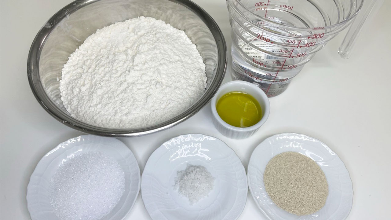 ① ボールに強力粉、ドライイースト、砂糖を加えて混ぜる