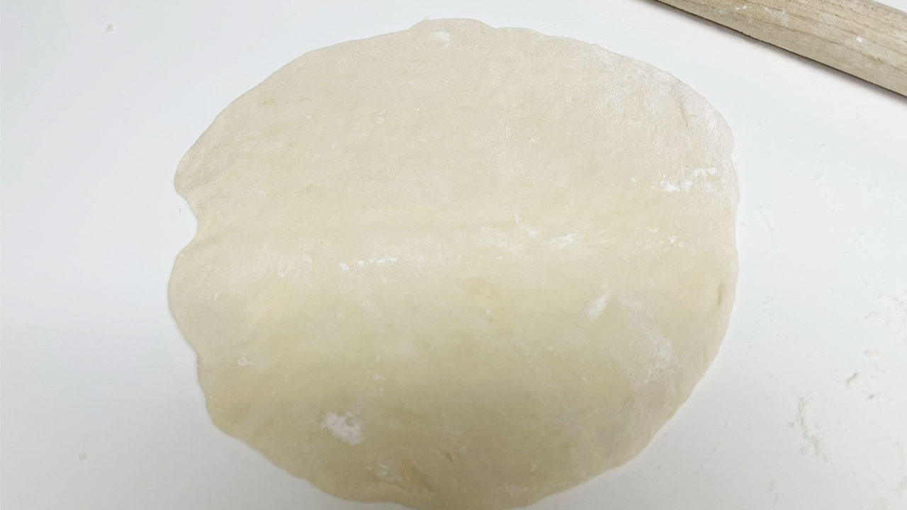 ⑥ 押しながらガス抜きし、お好みで20〜25センチの大きさに伸ばす