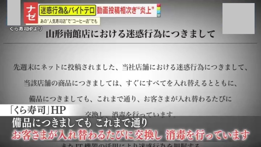 「先週末にネットに投稿されました、当社店舗における迷惑行為につきまして、当該店舗の商品につきましては、すぐにすべてを入れ替えるとともに、備品につきましても、これまで通り、お客様が入れ替わるたびに交換し、消毒を行っています。尚、実行者についてはすでに特定しており、地元警察に相談しながら対応を進めてまいります。多くのお客さまにご利用いただく飲食店として、許される行為ではなく、厳正な対応をしていく予定です」