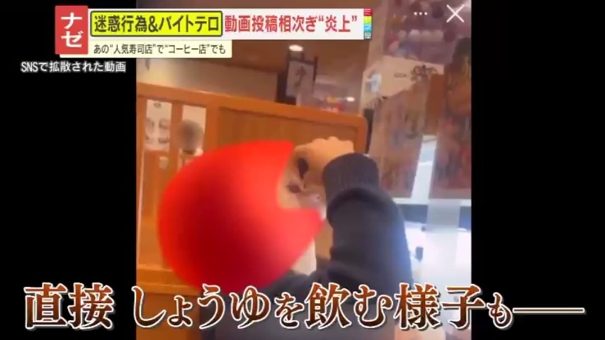 そして、動画の最後には、しょうゆ差しから直接しょうゆを飲む様子も映っていました。この動画はSNSで拡散され、炎上しています。