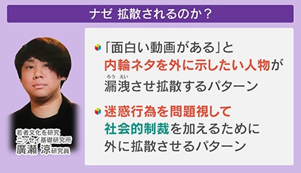 拡散する理由は2つあり、「面白い動画がある」と内輪ネタを外に示したい人物が漏洩させ、拡散するパターンと、迷惑行為を問題視して、社会的制裁を加えるために外に拡散させるパターンがあるということです。