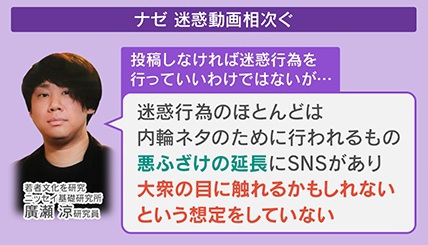 なぜ、これだけ迷惑動画が続くのか、若者文化を研究しているニッセイ基礎研究所・廣瀬涼研究員によると、「投稿しなければ迷惑行為を行っていいわけではないが、迷惑行為のほとんどは内輪ネタのために行われるもの。悪ふざけの延長にSNSがあり、大衆の目に触れるかもしれないという想定をしていない」ということです。
