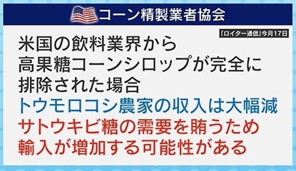 ただ、『ロイター通信』によると、コーン精製業者協会は「米国の飲料業界から高果糖コーン・シロップが完全に排除された場合、トウモロコシ農家の収入は大幅に減り、サトウキビ糖の需要を賄うため輸入が増加する可能性がある」としています。