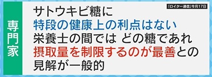 また、専門家は「サトウキビ糖に特段の健康上の利点はない。栄養士の間では、どの糖であれ摂取量を制限するのが最善との見解が一般的」との見解を示しています。