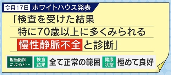 そんな中、2025年7月17日にホワイトハウスは、「検査を受けた結果、特に70歳以上に多く見られる『慢性静脈不全』と診断された」と発表しました。担当医師によると、検査結果は全て正常の範囲で、健康状態は極めて良好だということです。