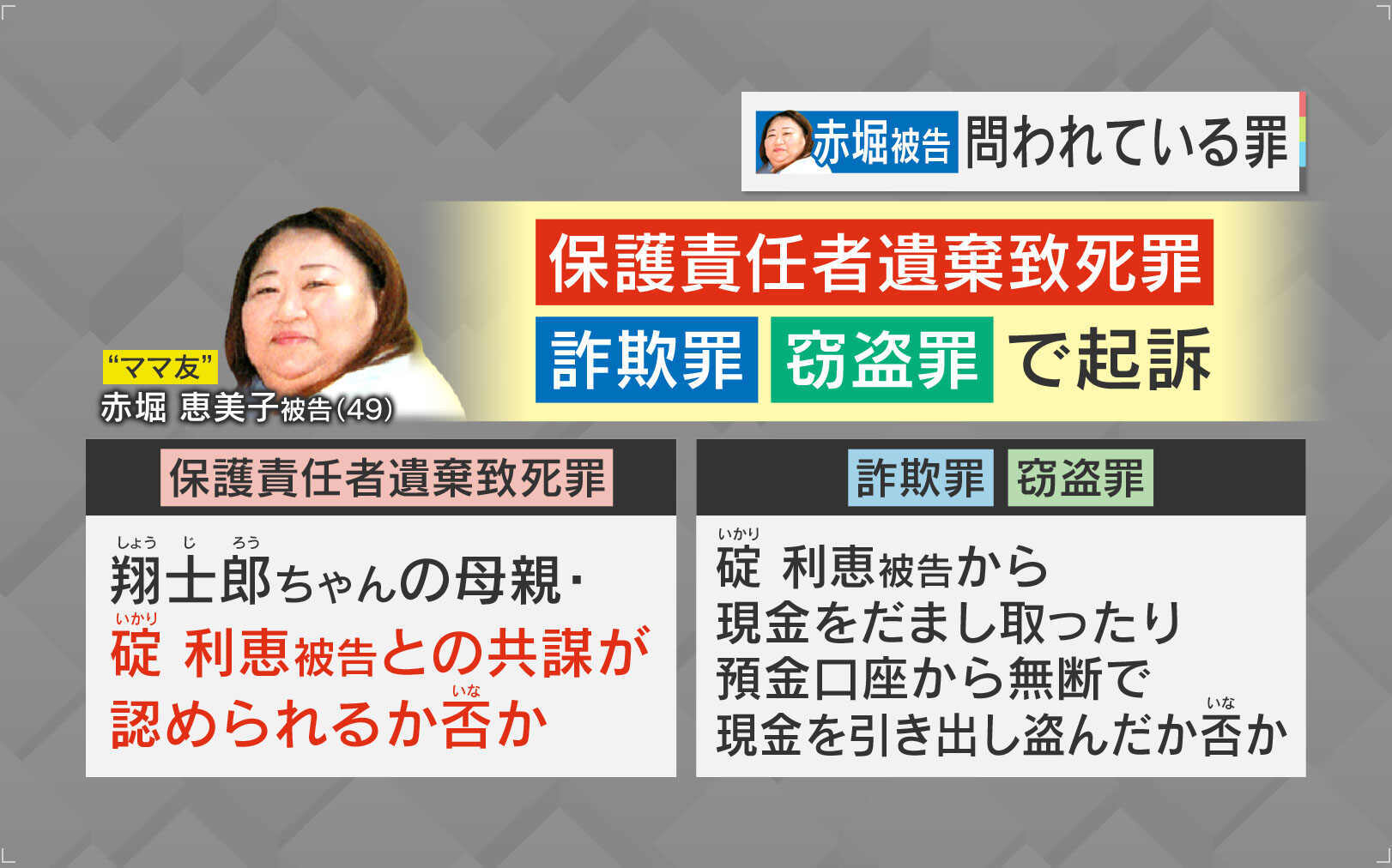 「この裁判はまず、保護責任者遺棄致死罪が赤堀被告に問えるかどうかの裁判でした。被害者にとって他人である赤堀被告と、被害者の母親の碇被告との共謀が成立するのは、赤堀被告の碇被告への支配が認められるかどうかということです。支配が認められないと、ほかの詐欺や窃盗も問えなくなります」