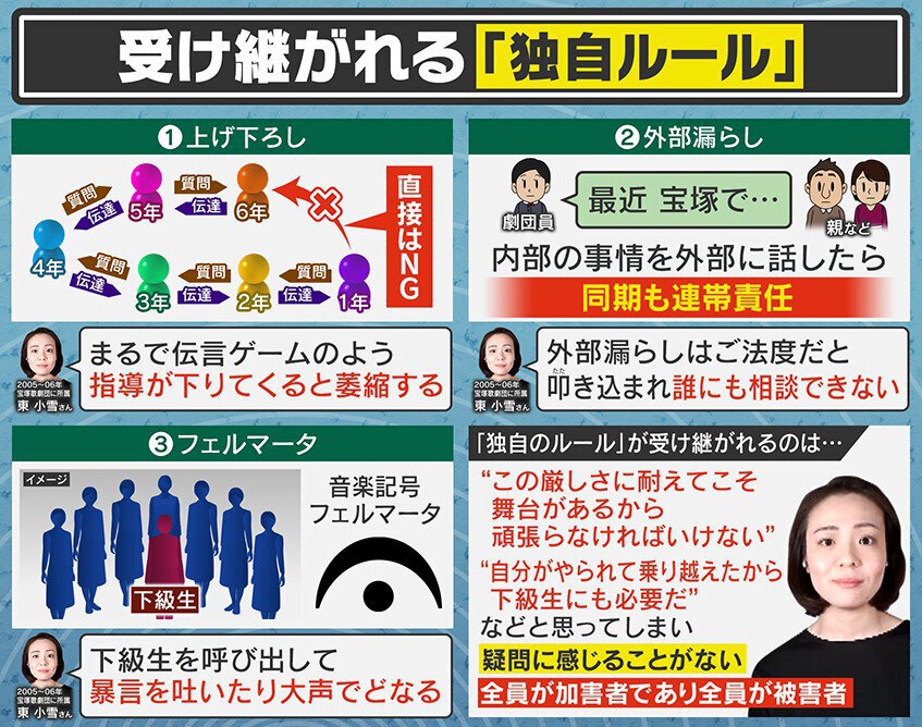 元タカラジェンヌの東小雪さんによると、1年目の団員は6年目の団員に直接質問できず、一つ上の団員にしか質問できないきないため、何段階もの人を介して質問をする「上げ下ろし」や劇団内部の事情を外部に話すと、同期全員が罰せられるという「外部漏らし」、一人の下級生を上級生数人で囲み暴言を吐いたり大声で怒鳴る「フェルマータ」というものなど、以前は独自のルールがあったということです。東さんは、これら独自のルールが受け継がれる理由を「『この厳しさに耐えてこそ舞台があるから頑張らなければならない』『自分がやられて乗り越えたから下級生にも必要だ』などと思ってしまい、疑問を感じることがない。全員が加害者であり全員が被害者」だと語っています。