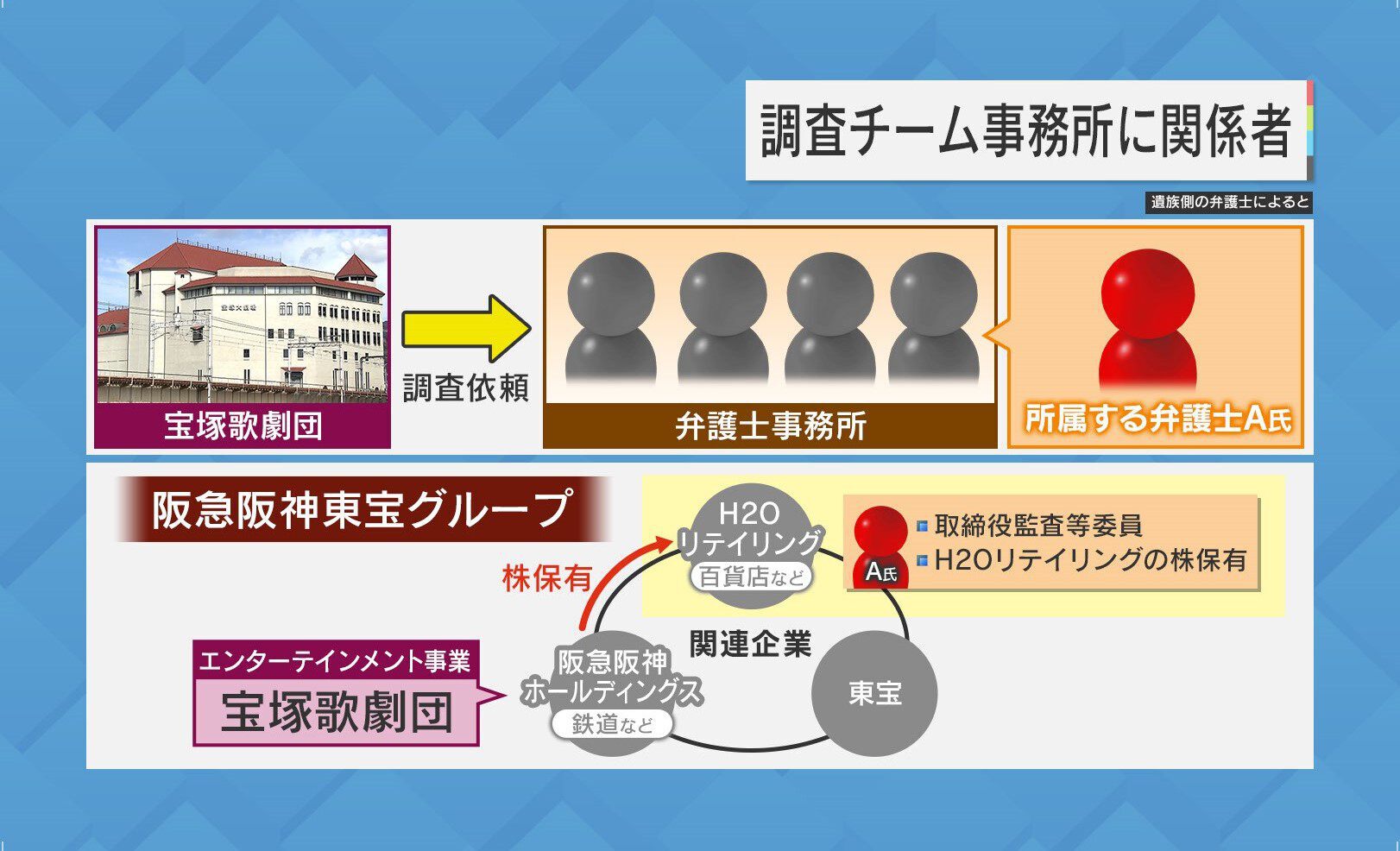 また、調査チームに劇団側の関係者がいたという指摘があります。劇団が調査を依頼した弁護士事務所に、阪急阪神東宝グループのH2Oリテイリングの取締役監査等委員がいたということです。宝塚歌劇団が属する阪急電鉄のある阪急阪神ホールディングスとH2Oリテイリングは同じ阪急阪神東宝グループの関連企業になります。
