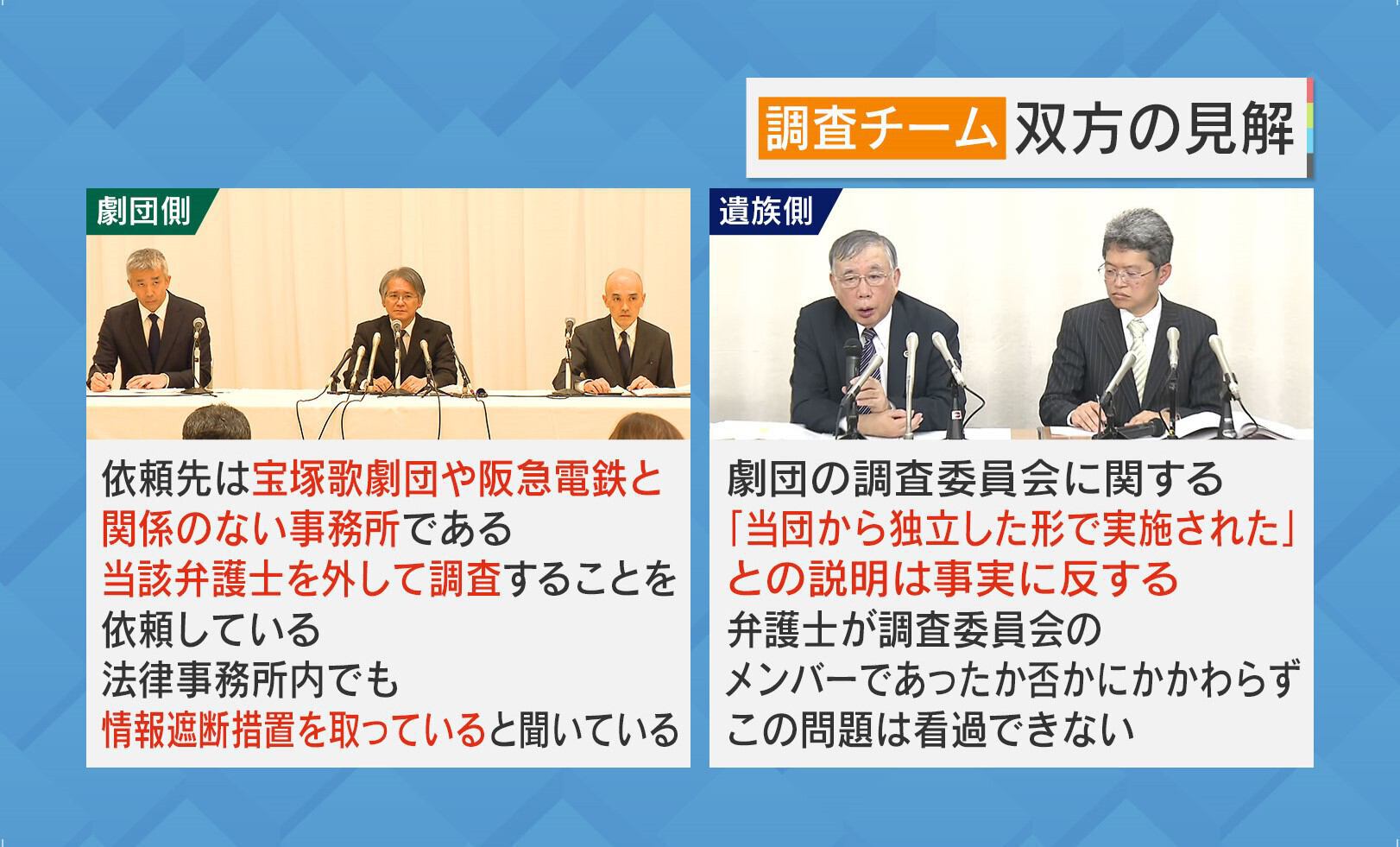 この指摘に関して劇団側は、「依頼先は宝塚歌劇団や阪急電鉄と関係のない事務所である。当該弁護士を外して調査することを依頼している。法律事務所内でも情報遮断措置をとっていると聞いている」としています。対して遺族側は、「劇団の調査委員会に関する、『当団から独立した形で実施された』との説明は事実に反する。弁護士が調査委員会のメンバーであったか否かに関わらず、この問題は看過できない」と反発しています。