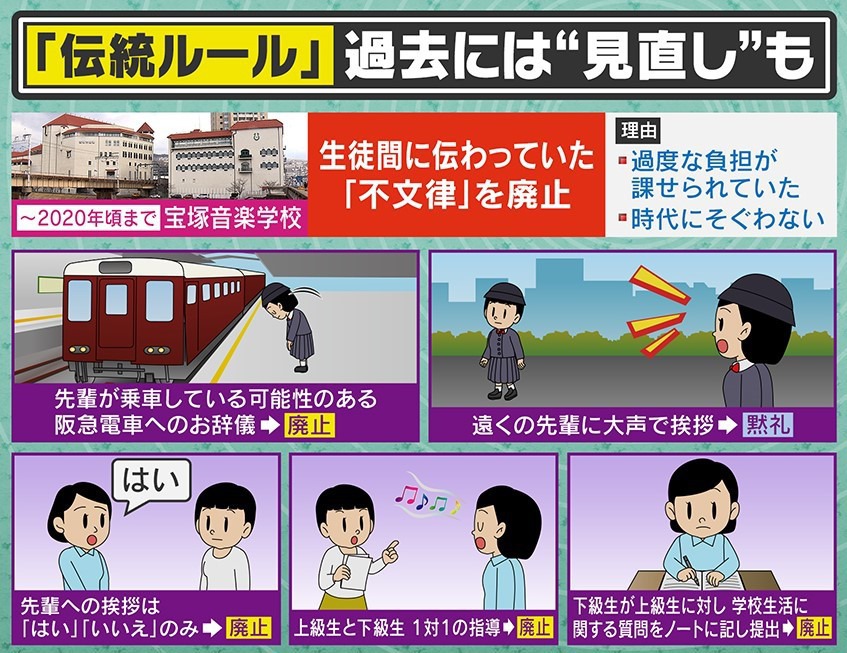 厳しい“伝統のルール”があるという宝塚歌劇団ですが、2020年ごろまでに、過度な負担が課せられた・時代にそぐわないなどを理由に生徒間に伝わっていた“不文律”を廃止したということです。例えば、「先輩が乗車している可能性のある阪急電車へのお辞儀」を廃止、「遠くの先輩に大声で挨拶」も黙礼へ、「先輩への挨拶は『はい』『いいえ』のみ」も廃止、「上級生と下級生1対1の指導」も廃止、「下級生が上級生に学校生活に関する質問をノートに記し提出」を廃止などです。
