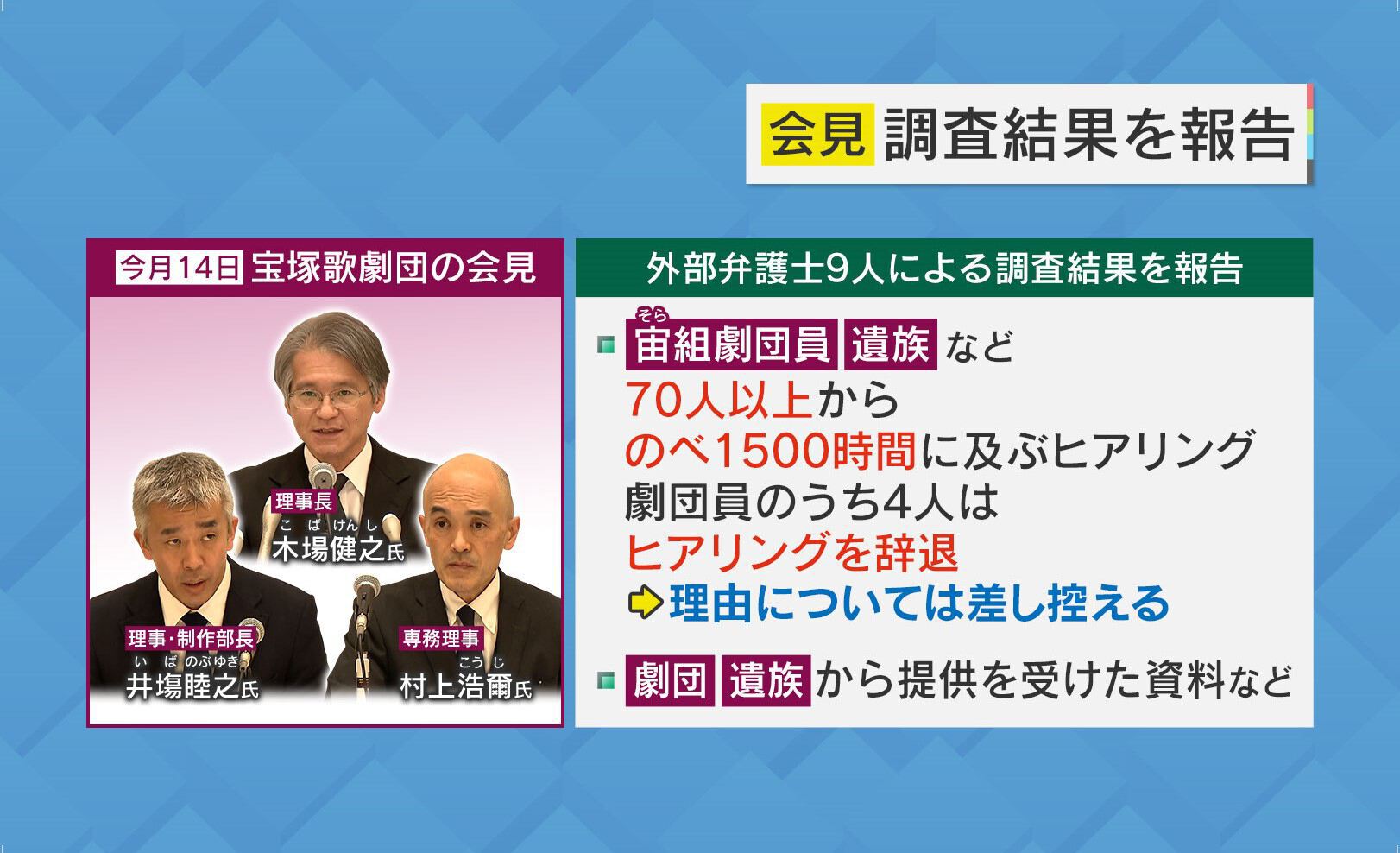 11月14日、宝塚側の会見で外部弁護士9人の調査委員会による調査結果が発表されました。調査委員会は、宙組劇団員や遺族など70人以上から、延べ1500時間に及ぶヒアリングを行ったということですが、劇団員のうち4人はヒアリングを辞退したということで、その理由は差し控えるということでした。報告の内容は、過重労働は一部認めるものの、いじめやパワハラは確認できなかった、というものでした。今回、聞き取りの対象を広げることについて、阪急阪神ホールディングスの幹部は、過去のトラブルに触れ「音楽学校でも、かつて生徒が飛び降りる事案があった。そこから色々と変えてきたつもり。雰囲気や慣習は組によっても違うし音楽学校でも違う。だから今回のことを受けて宙組以外にも聞き取りを行うことにした」と話しました。