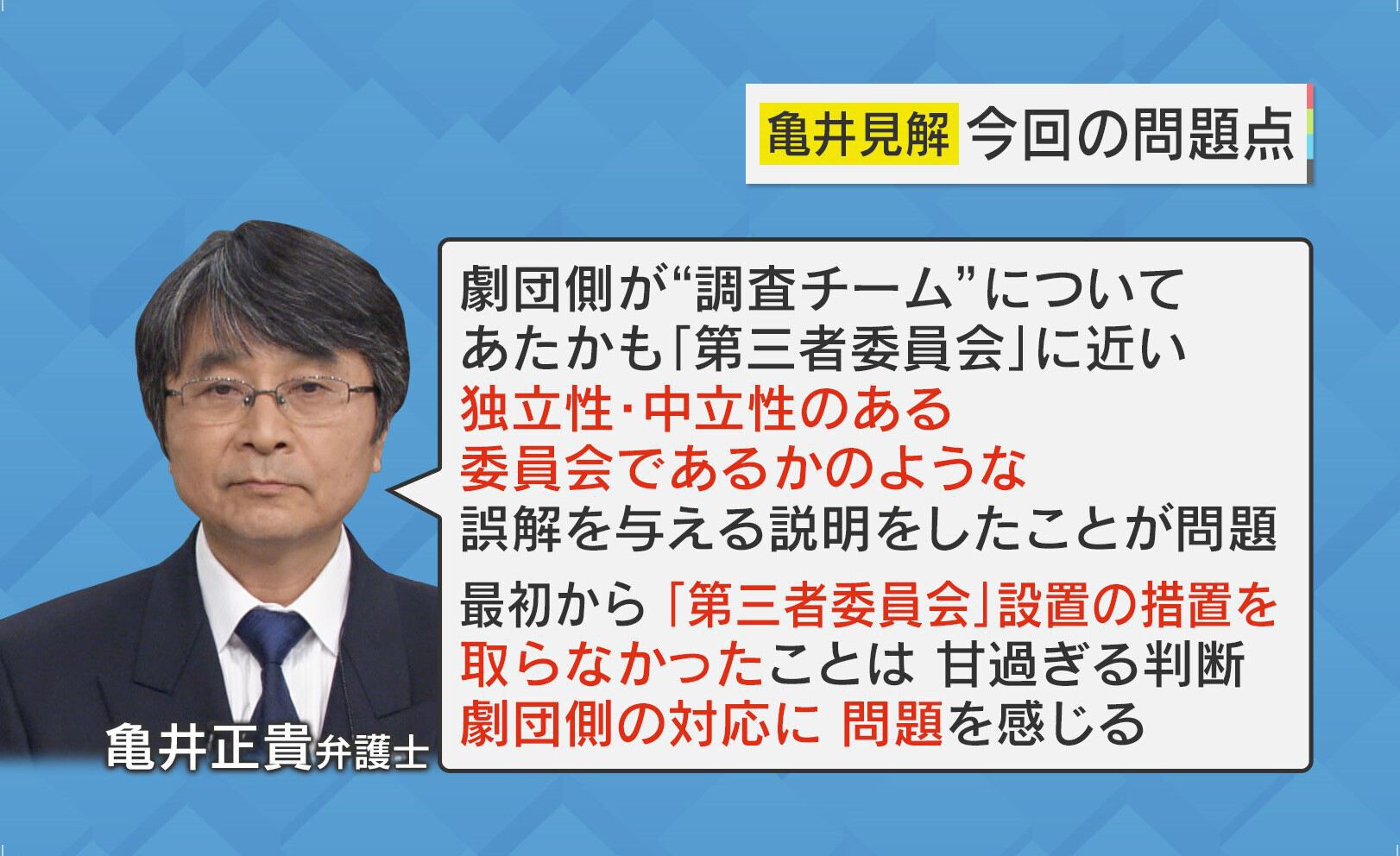 亀井正貴弁護士は、今回の問題点について「劇団側が“調査チーム”についてあたかも『第三者委員会』に近い独立性・中立性のある委員会であるかのような誤解を与える説明をしたことが問題。最初から『第三者委員会』設置の措置をとらなかったことが甘過ぎる判断。劇団側の対応に問題を感じる」と話しています。