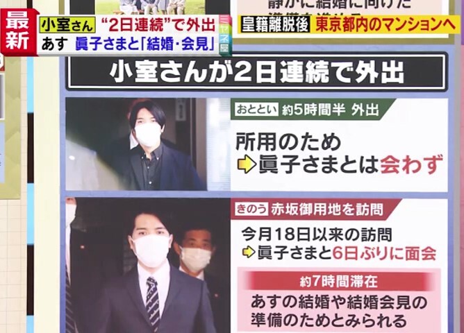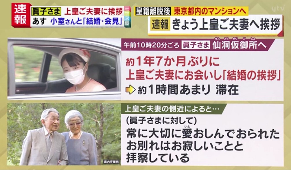 秋篠宮家の長女、眞子さまは10月25日、上皇ご夫妻への挨拶を終えました。皇籍離脱後ですが、しばらくは東京都内のマンションで暮らし、渡航手続きなどを終えてから、小室圭さんとの生活拠点となるアメリカに向かわれるということです。一方、小室さんですが、10月24日、赤坂御用地を訪問し、眞子さまと結婚会見の準備などを進めたとみられます。元・宮内庁職員で皇室ジャーナリストの山下晋司さんと、国際弁護士の清原博さんが独自解説します。