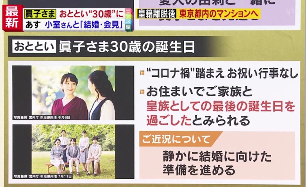 10月23日、眞子さまは30歳に。皇族としての、最後の誕生日でもありました。誕生日のお祝いの行事は行われず、お住まいで家族水入らずの時間を過ごされたとみられます。
