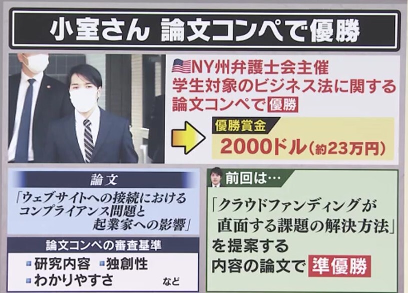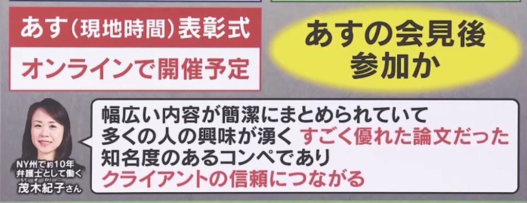 この論文の、どのような点が評価されたのか。ニューヨーク州で勤務する茂木(もてぎ)紀子弁護士は、「構成面でも内容面についてもすごく読みやすい文章だなと思いました。ビジネスをオンラインでされる場合には注意されるべきことを簡潔に、いろんな側面から述べられている感じがします」。論文の独自性、わかりやすさなどが審査基準となっていて、実は、小室さん、2020年もこのコンペで準優勝に輝いていました。