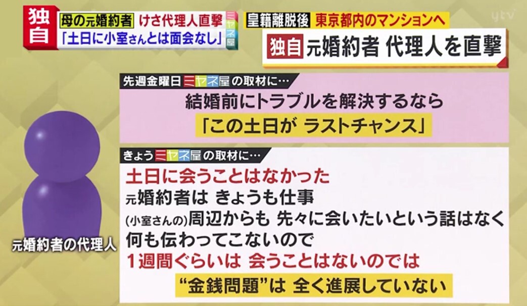 小室さんの母の元婚約者の代理人が、10月22日にミヤネ屋が行った独自取材で、結婚前にトラブルを解決するならば「この土日がラストチャンス」と話していましたが、10月24日の取材では「元婚約者はこの土日は小室さんとは面会していない」と明らかにしました。