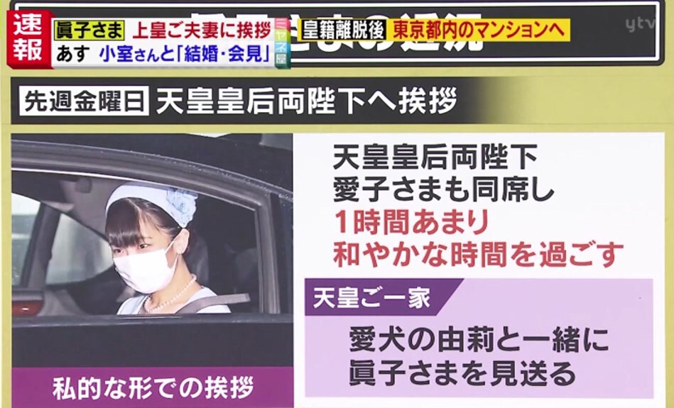 眞子さまは、10月22日に天皇皇后両陛下へご挨拶をされました。儀式としてではなく私的な形でのご挨拶となりました。そこには愛子さまも同席されて、1時間余り和やかな時間を過ごされたということです。天皇ご一家は、愛犬と一緒に眞子さまを見送られました。